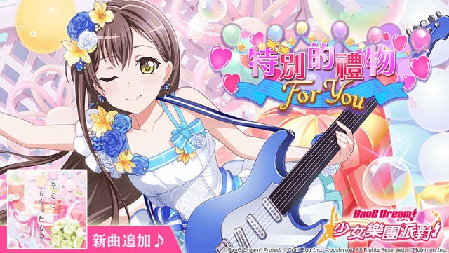 由移動怪獸代理,日本公司「武士道(Bushiroad)」CraftEgg開發製作的手機音樂節奏遊戲《BanGDream!少女樂團派對》於近日推出期間限定「里美的禮物之歌」活動,同步推出「特別的禮物ForYou」活動轉蛋,其中吉他手「花[詳細]