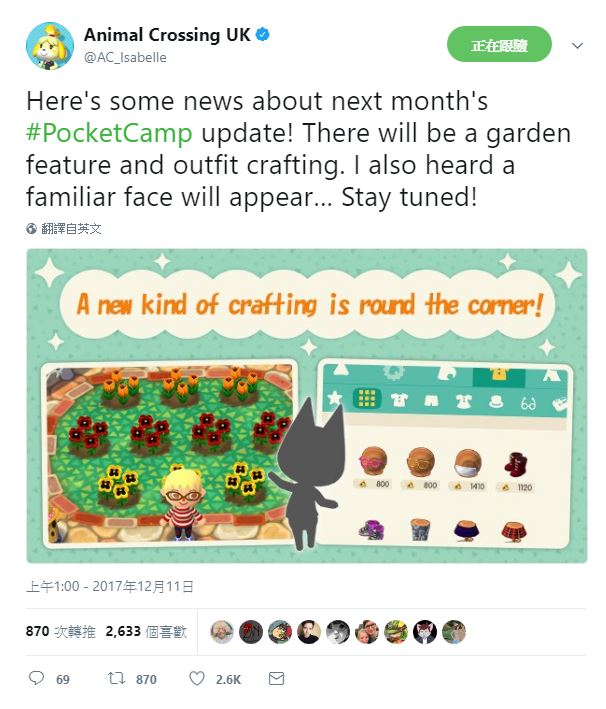 任天堂旗下智慧型手機遊戲《動物之森口袋露營廣場(暫譯,原名:どうぶつの森ポケットキャンプ)》(iOS/Android)於今(12)日宣布將於1月的更新推出「花園功能」以及「服裝製作」系統。[詳細]