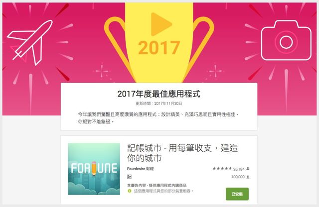 GooglePlay今(1)日公布「2017年度最佳應用程式」,由台灣獨立製作團隊今年推出的《記帳城市》,透過將遊戲元素注入無聊的記帳過程,榮獲年度最佳應用程式,同時,這也是首度由台灣開發的App同時登上香港、韓國、印[詳細]
