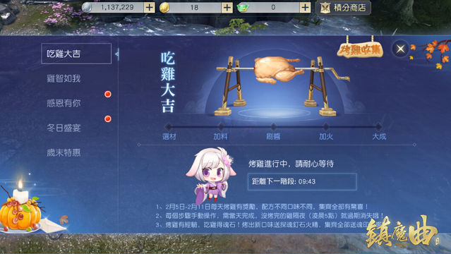 由網易互動娛樂有限公司研發的東方幻想手機MMO《鎮魔曲》於今(5)日正式上線歲末吃雞活動。直到2月11日止,五大活動齊開、烤雞吃雞一條龍。營運團隊表示,將有高級珍稀道具、圖紙、稀有掛飾等獎勵送上。[詳細]