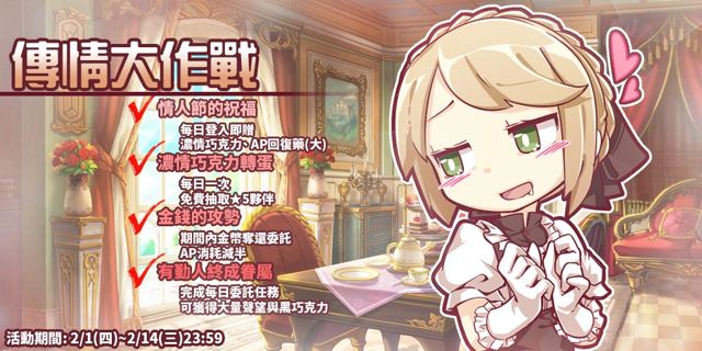 由希娜科技藝術團隊所自製營運的手機遊戲《境界之詩Tactics》(iOS/Android),今(1)日推出「情人節大作戰」活動,釋出全新五星角色「靈異女僕.夕霧」並開啟「失控的夕霧」騎士團副本任務,一併推出「傳情大作戰」[詳細]