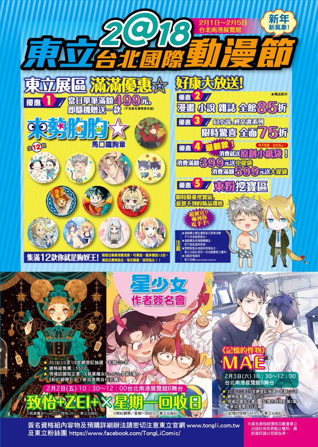 新年來臨,離【2018年第6屆國際動漫節】開展也已經不到一個月!此次東立出版社除了有超強陣容的作家簽名會,動漫節現場攤位的滿額禮及優惠也依舊豐富,讓您在買書同時還能享有各種回饋!另外日本唯美BL天[詳細]