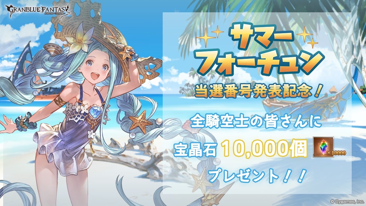 由Cygames開發的手機網頁遊戲《碧藍幻想(グランブルーファンタジー)》近日公開「幸運夏日(SummerFortune,サマーフォーチュン)」中獎號碼,而為了紀念本活動的實施,官方也向全體騎空士贈送寶晶石10,000個。玩[詳細]