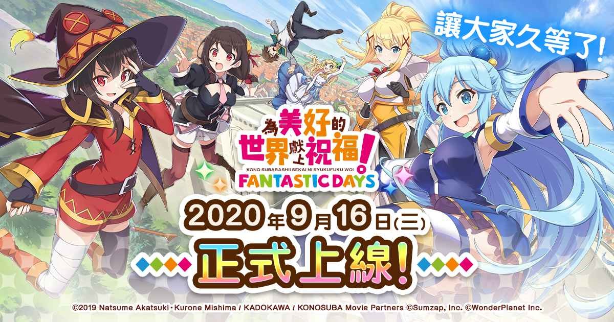 由WonderPlanetInc.(總公司:名古屋市,CEO:常川友樹,以下簡稱「本公司」)發行及營運,改編自人氣動畫《為美好的世界獻上祝福!》首款手機遊戲《為美好的世界獻上祝福!FantasticDays》(以下簡稱《美好世界FD[詳細]
