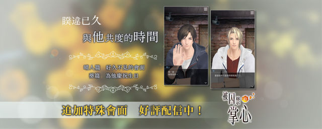 台灣卡普空宣布,行動遊戲《被囚禁的掌心》首波更新會面內容於今日(10/13)正式釋出,台日同步上架,更新內容包含「晴人」和「葵」各一篇特殊會面,分別為「好久不見的會面」與「為他慶祝生日」。[詳細]