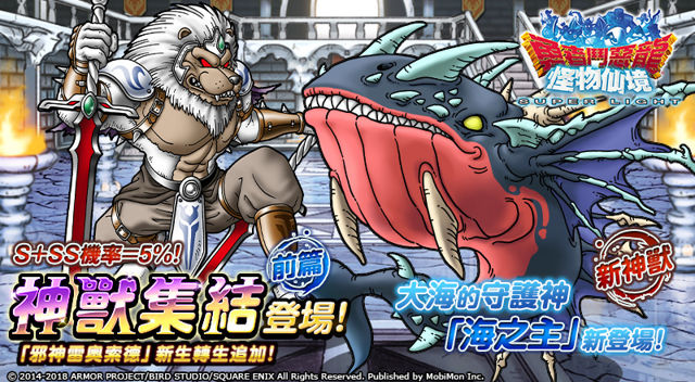 移動怪獸代理SQUAREENIX日本RPG《勇者鬥惡龍 怪物仙境 SUPERLIGHT》今日宣布,推出魔法地圖抽選「神獸集結」前篇、新神獸海之主登場,「海之主、邪神雷奧索德」機率UP,同時「邪神雷奧索德」新生轉生追加,期間[詳細]