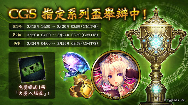 日本Cygames旗下王道卡牌對戰遊戲《闇影詩章Shadowverse》於3月15日公開遊戲內競技場中的「大賽」新功能,首屆「CGS(Chronogenesis)時空轉生」指定系列盃也同步開打,只要登入遊戲即可免費獲得1張「大賽入場券」,[詳細]