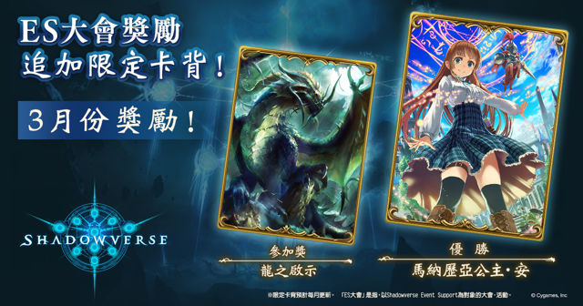 日本Cygames推出的卡牌對戰遊戲《闇影詩章Shadowverse》,於本日正式公開3月份ES大會(EventSupport)的限定卡背獎勵內容,參加獎卡背為「龍之啟示」,優勝限定卡背則為「馬納歷亞公主.安」,玩家可以透過參加各店家[詳細]