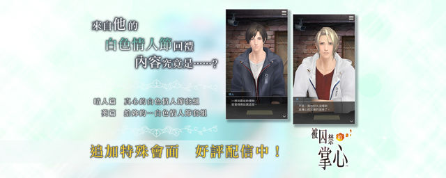 台灣卡普空宣布,日系戀愛手機遊戲《被囚禁的掌心》中文版自從去年十月中旬宣布追加遊戲内特殊會面起,至今已推出第十次更新內容,共計20篇會面,每篇皆有不同主題,由個性迥異的兩位帥氣男主角「晴人」與「葵」用溫[詳細]