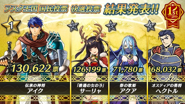 任天堂於近日宣布,旗下智慧型手機遊戲《聖火降魔錄英雄雲集(ファイアーエムブレムヒーローズ)》(iOS/Android)日前實施的人氣投票企劃「亞斯克王國國民投票」(2018年2月2日~2月20日)的票選結果,由「傳承神將[詳細]