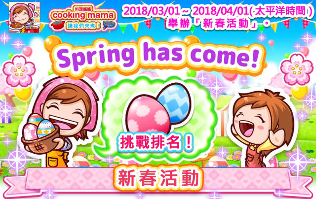 OFFICECREATECorp.宣布於2018年3月1日開始,將舉辦iPhone/AndroidAPP《料理媽媽cookingmama讓我們來煮!》的新春活動。還會開始販售符合春天氣息的新食譜包“櫻花禮包”。[詳細]